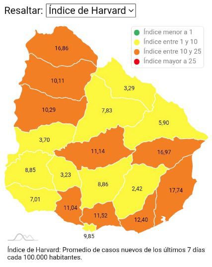 Uruguay volvió este domingo a la zona amarilla del índice de Harvard, que acumula el promedio semanal de casos nuevos de covid-19 por cada 100.000 habitantes, al registrar 9,64 y alcanza este nivel luego de siete meses.